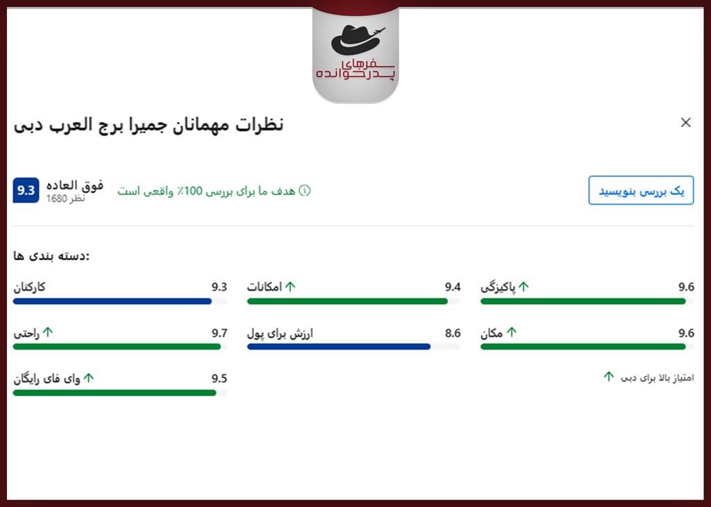 به طور کلی، برج العرب به عنوان یکی از لوکس‌ترین و معروف‌ترین هتل‌های دنیا، تجربه‌ای مجلل و بی‌نظیر از اقامت را ارائه می‌دهد که بیشتر مهمانان از آن رضایت دارند. امکانات گسترده، خدمات شخصی و توجه به جزئیات از نکات برجسته‌ای هستند که باعث شده بیشتر مسافران تجربه‌ای خوب و فراموش‌نشدنی از اقامت خود داشته باشند. با این حال، هزینه‌ی بالا و گاهی شلوغی در برخی نقاط هتل از مواردی هستند که در نظرات برخی مسافران بازتاب داشته است. برخی افراد نیز ممکن است احساس کنند که فضای رسمی هتل بیش از حد لوکس و محدودکننده است. در نهایت، هتل برج العرب برای افرادی مناسب است که به دنبال تجربه‌ای لوکس، متفاوت و ویژه هستند و حاضرند برای این سطح از خدمات هزینه بالاتری بپردازند.