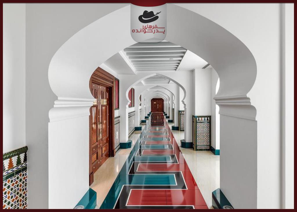 استفاده از طلا و ابریشم: در لابی، از طلا و ابریشم‌های گران‌قیمت استفاده شده که باعث ایجاد فضایی فوق‌العاده لوکس و چشمگیر می‌شود. سقف لابی به‌طور خاص با رنگ‌های طلایی و الگوهای هندسی به شکلی زیبا طراحی شده است.