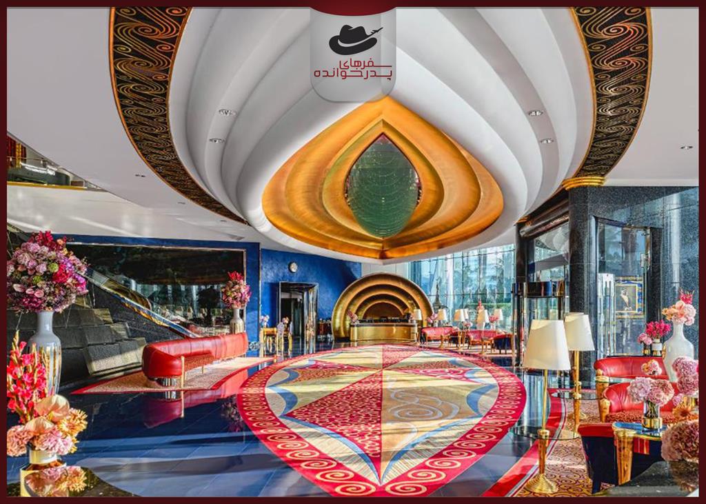 وقتی وارد برج العرب می‌شوید، اولین چیزی که توجه شما را جلب می‌کند، لابی مجلل و عظیم آن است. این فضا به‌طور خاص با استفاده از رنگ‌های غنی، مواد باکیفیت و طراحی‌های چشمگیر تزئین شده است.