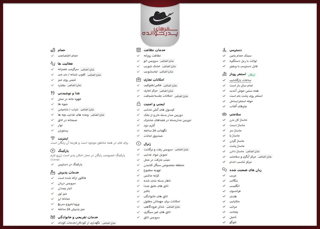 امکاناتی مانند استخر روی پشتبام، خدمات 24 ساعته اتاق و بوفه صبحانه با تنوع قابلقبول مورد استقبال قرار گرفتهاند.