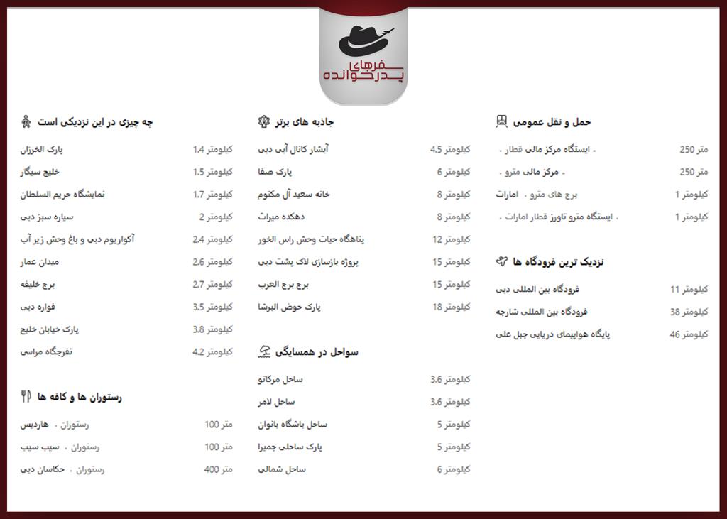 همچنین، هتل در نزدیکی برخی از مهم‌ترین جاذبه‌های دبی قرار دارد. برج‌الخلیفه، بلندترین ساختمان جهان، تنها چند دقیقه با هتل فاصله دارد. این نزدیکی به برج‌الخلیفه، که مرکز تجاری، تفریحی و فرهنگی دبی محسوب می‌شود، باعث می‌شود که مسافران هتل به راحتی به این جاذبه دسترسی داشته باشند. علاوه بر این، دبی مال، بزرگ‌ترین مرکز خرید جهان، نیز در نزدیکی هتل قرار دارد که برای خریداران و گردشگران بسیار جذاب است. در کنار این جاذبه‌ها، دسترسی به ایستگاه‌های مترو و دیگر وسایل حمل‌ونقل عمومی از هتل بسیار آسان است. این امر سبب می‌شود که مسافران برای سفر به سایر نقاط دبی و بازدید از جاذبه‌های مختلف شهر، هیچ گونه مشکلی نداشته باشند.
