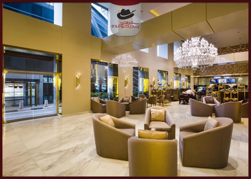 لابی بزرگ با ارتفاع سقف بلند و دکوراسیون لوکس طراحی شده است.