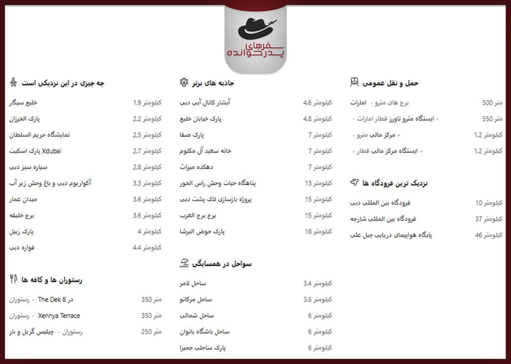 نزدیکی به جاذبههایی مانند برج خلیفه، دبی مال، و مراکز تجاری.