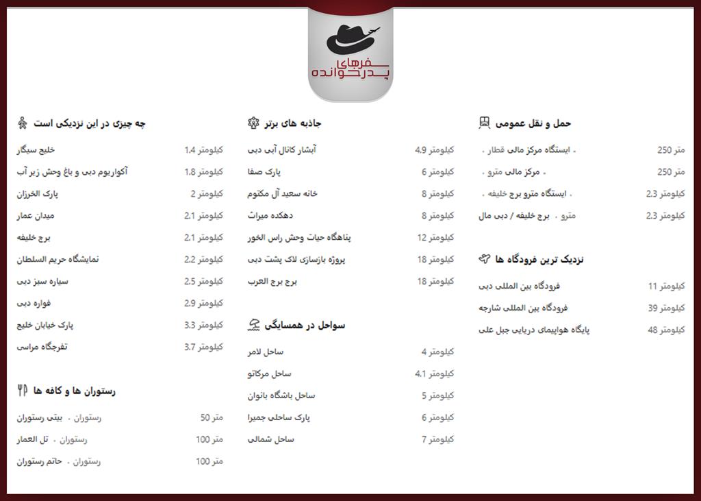موقعیت مکانی عالی: بسیاری از مسافران به موقعیت استراتژیک هتل اشاره کردهاند که دسترسی آسان به برج خلیفه، دبی مال و دیگر جاذبههای معروف دبی را فراهم میکند. این ویژگی برای افرادی که هدفشان گردشگری یا خرید در دبی است، بسیار جذاب است.