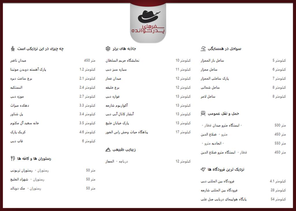 دسترسی به نقاط مختلف شهر: با استفاده از مترو، تاکسی یا حتی پیادهروی، مهمانان میتوانند به راحتی به تمام مناطق اصلی دبی دسترسی داشته باشند.