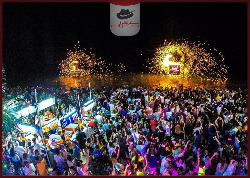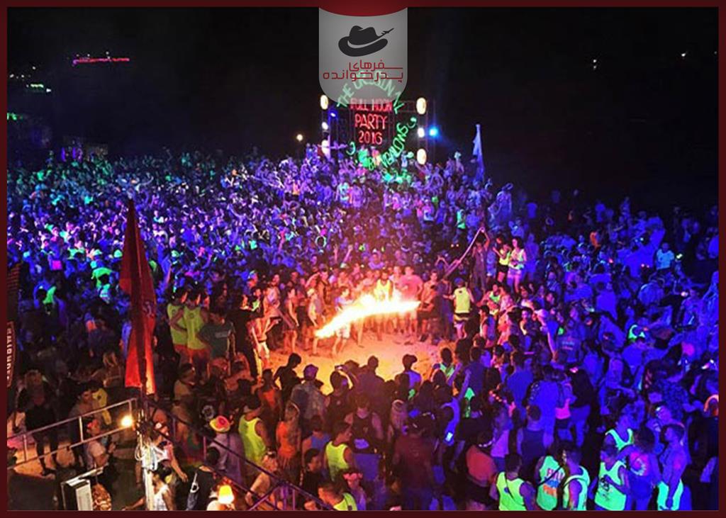 2) نورپردازی خیرهکننده: استفاده از نورهای نئون و تزئینات رنگارنگ، فضایی رویایی و جادویی در ساحل ایجاد میکند که تجربهای منحصر به فرد از شب ماه کامل ارائه میدهد.
